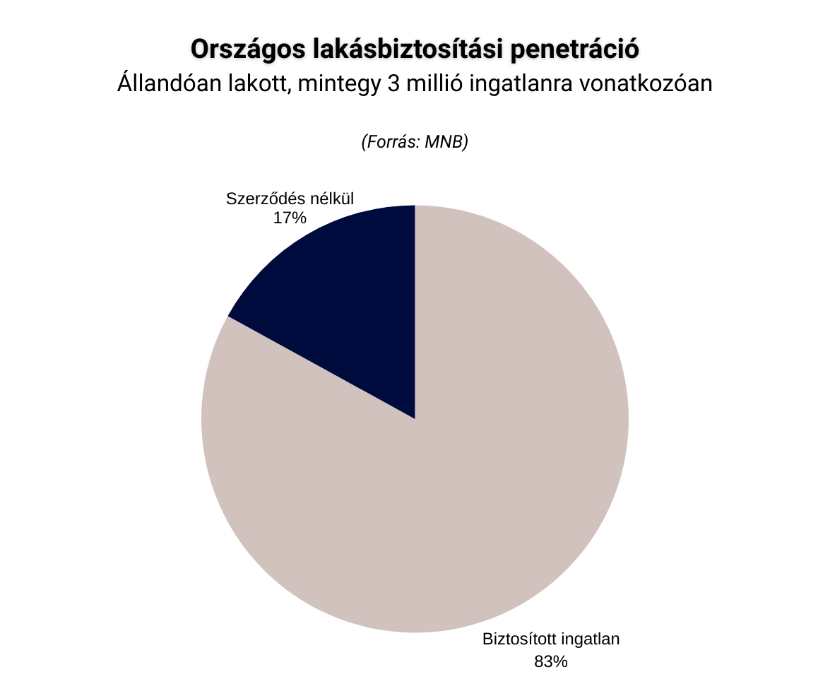 Az MNB legfrissebb adatai alapján az állandóan lakott, egyedileg biztosított ingatlanok körülbelül 83%-ára kötöttek teljeskörű lakásbiztosítást. Ez azt jelenti, hogy nagyjából minden ötödik otthon nincs ilyen védelemmel lefedve.