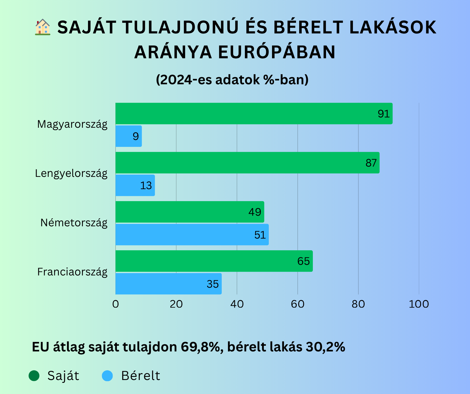 Magyarországon, és tágabban Kelet-/Közép-Európában rendkívül magas az aránya azoknak, akik saját tulajdonú lakásban élnek. Az Eurostat adatai szerint az EU-átlag közel 70%, míg nálunk ez az arány meghaladja a 91%-ot. Ez nemcsak gazdasági jelenség, hanem kulturális is, nálunk a saját otthon nem csupán státuszszimbólum, hanem az önállóság és a biztonság egyik legfontosabb jelképe.